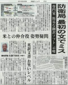 20160408 沖縄タイムス P31 専門家簡易な翻訳ソフト示唆 防衛局最初の文でミス 米国との仲介役姿勢疑問